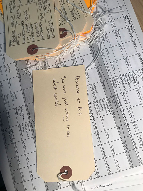 Composed of 3,205 handwritten toe tags that represent migrants who have died trying to cross the Sonoran Desert of Arizona between the mid-1990s and 2019, the ongoing project includes participants from several communities—including Fordham.