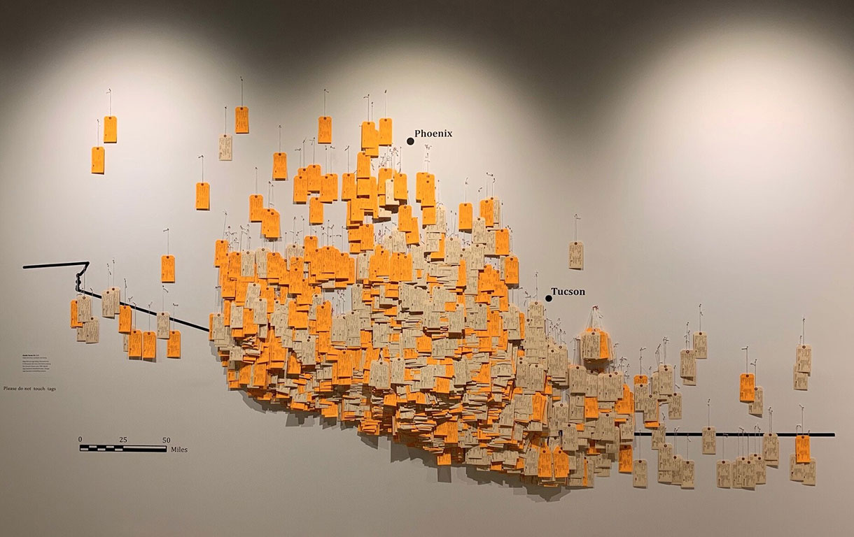The exhibit is part of a series of pop-up exhibits that the Undocumented Migration Project has promoted at 150 locations around the world. The tally begins with migrants who attempted to cross the border in 1994 because that was the year that the United States Border Patrol formally implemented an enforcement strategy known as “Prevention Through Deterrence.” The idea was that discouraging undocumented migrants from attempting to cross the U.S./Mexico border near ports of entry would force them to attempt to cross through areas such as the Sonoran Desert, and the treacherous natural environment would act as a deterrent.