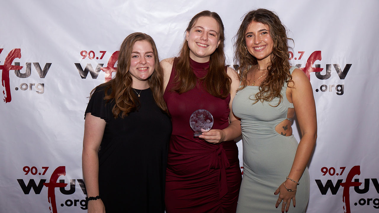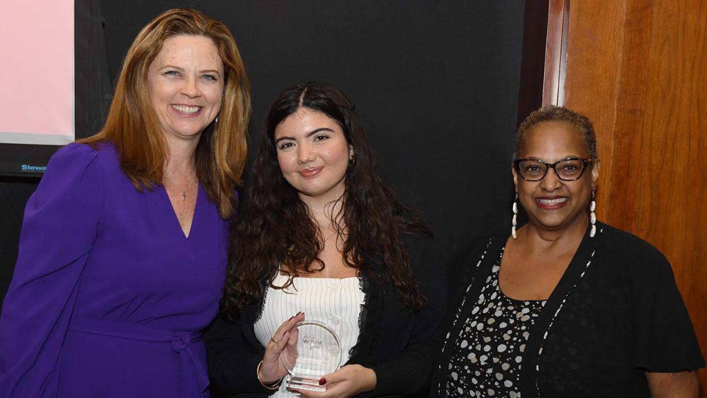 Christina Ljuljic, FCRH 24 (center), former student news manager at WFUV, received the WFUV Award for Excellence in News Journalism at the gala. She is joined by Fordham President Tania Tetlow (left) and Robin Shannon, news and public affairs director at WFUV. Photo by Chris Taggart