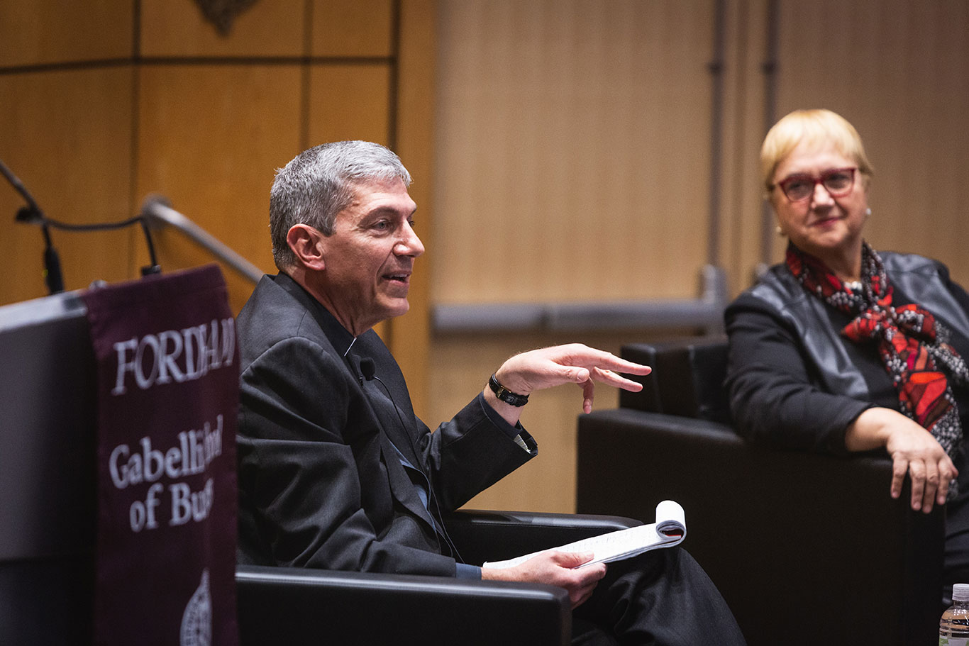The evening chat hosted by the Gabelli School of Business brought together Lidia Bastianich, a co-founder of iconic Italian eateries such as Eataly and Del Posto, and Steve Katsouros, S.J., GSE ’87, dean and executive director of Arrupe College at Loyola University Chicago.