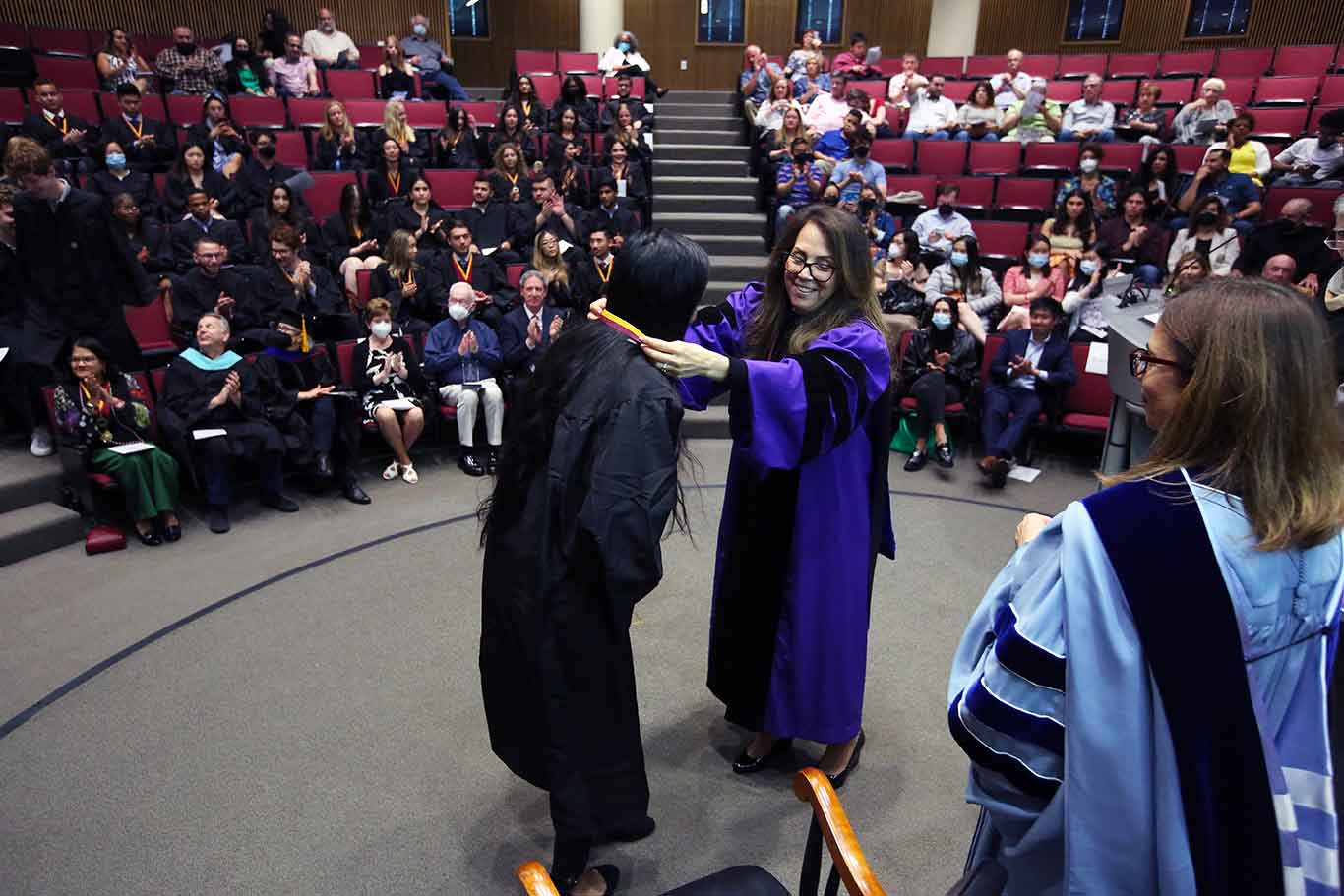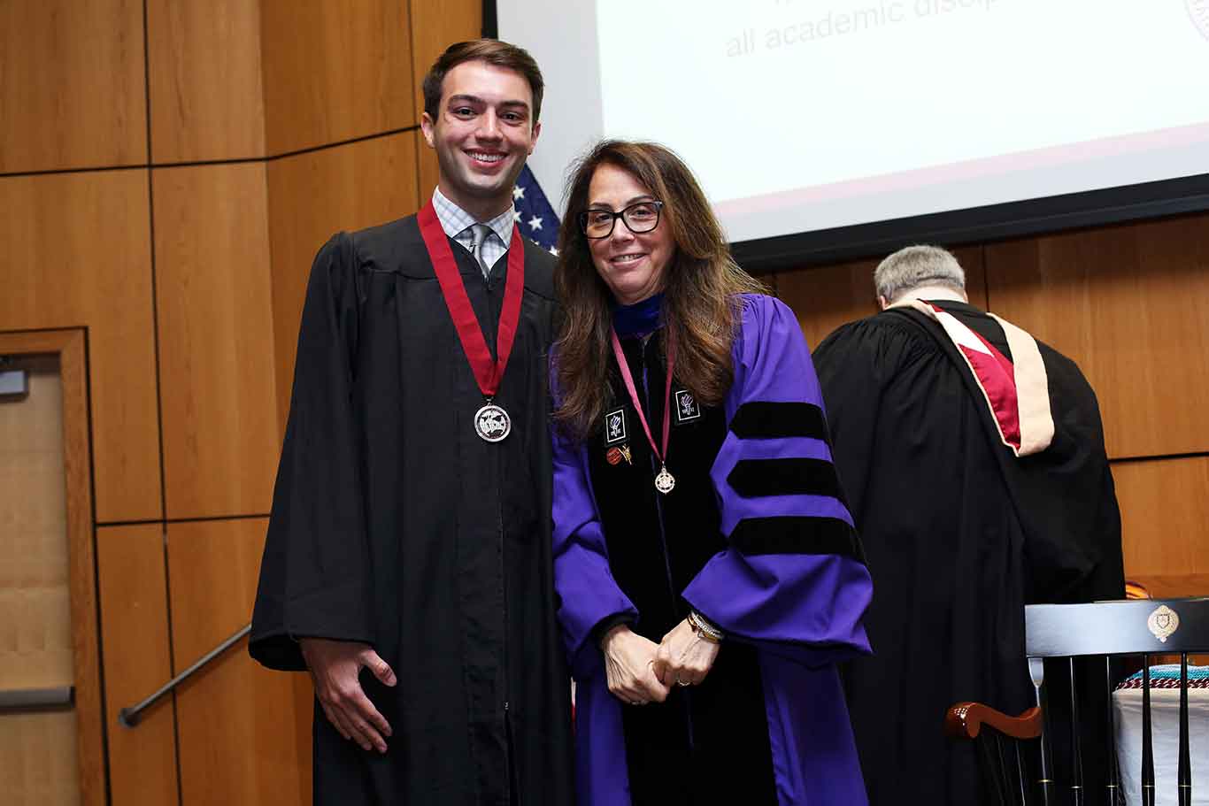 Rapaccioli noted in her remarks that the students, all of whom were earning a Bachelor of Science in Global Business, were part of a program that has grown at a remarkable clip, from around 50 when it debuted in 2017, to 156 this year. What’s more, three of the students also earned second degrees in philosophy, psychology, and history, and 30 completed minors in the humanities.