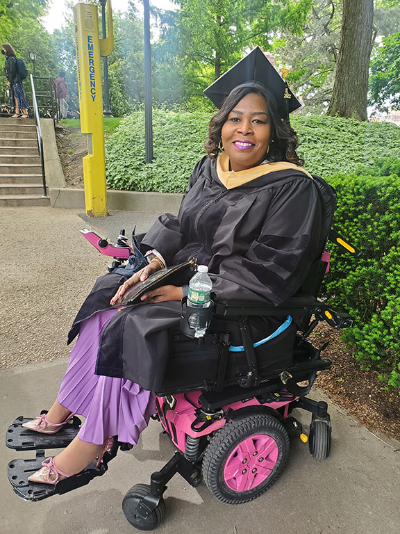 Several graduates echoed the importance of being present. Jessica Champagnie, a native of the Bronx who was paralyzed from the waist down by an errant bullet when she was 19, enrolled in the GSS online program because it felt safer than in person learning, she said. She decided to become a social worker because when she was shot, it was social workers who, along with her family and friends, helped her rebuild her life.