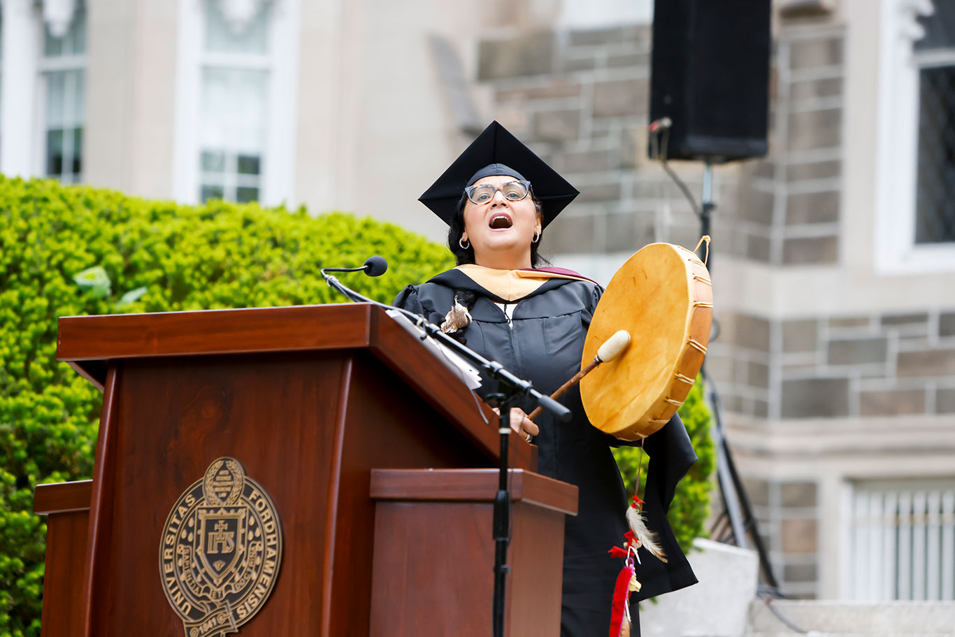 “We use the drum as a way to call to action,” she said after acknowledging the Munsee and Lenape indigenous peoples who called the land where Fordham sits home.