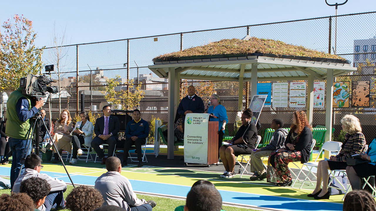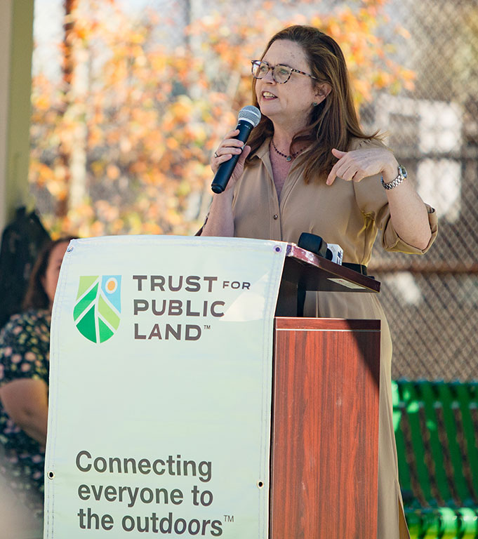 Serapha Cruz, the principal of MS 331 in the Bronx, addresses attendees at the ribbon-cutting ceremony for a new playspace.