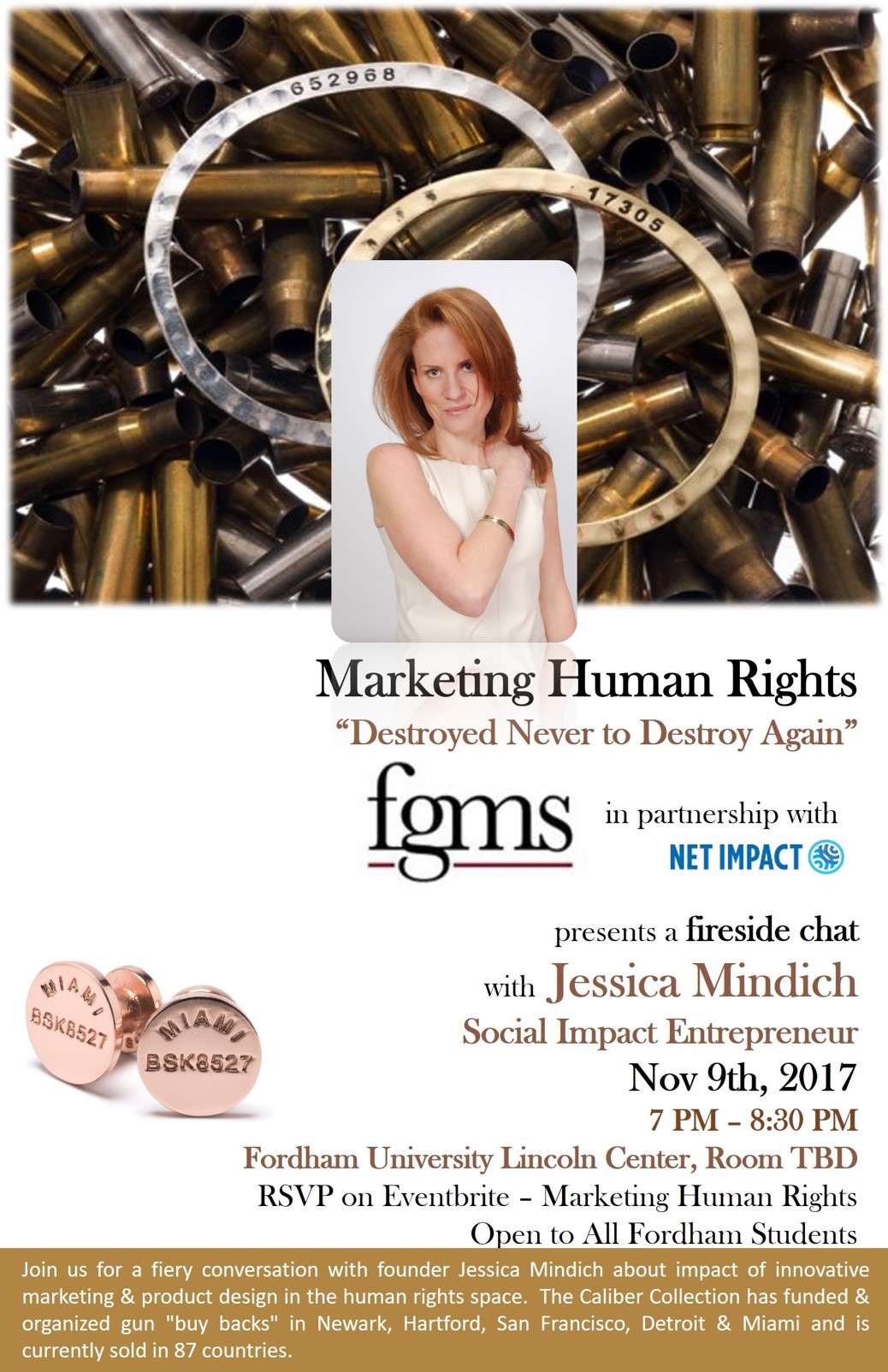 After Las Vegas, the deadliest act of gun violence in the history of the the United States, Americans remain politically divided over gun regulations. Jessica Mindich, former General Council turned founder of The Caliber Collection, gives clear visibility to the human rights implications of gun violence by sponsoring gun “buy backs” in inner cities across the United States. The Caliber Collection recycles guns into powerfully communicative personal accessories and public art projects that focus on solutions to manage gun proliferation.