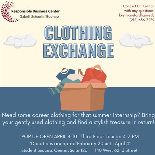 Tuesday, April 8, 2025, 4 – 7 p.m. Responsible Business Center Annual Sustainable Clothing Drive Spring 2025 Responsible Business Center Annual Sustainable Clothing Drive Spring 2025