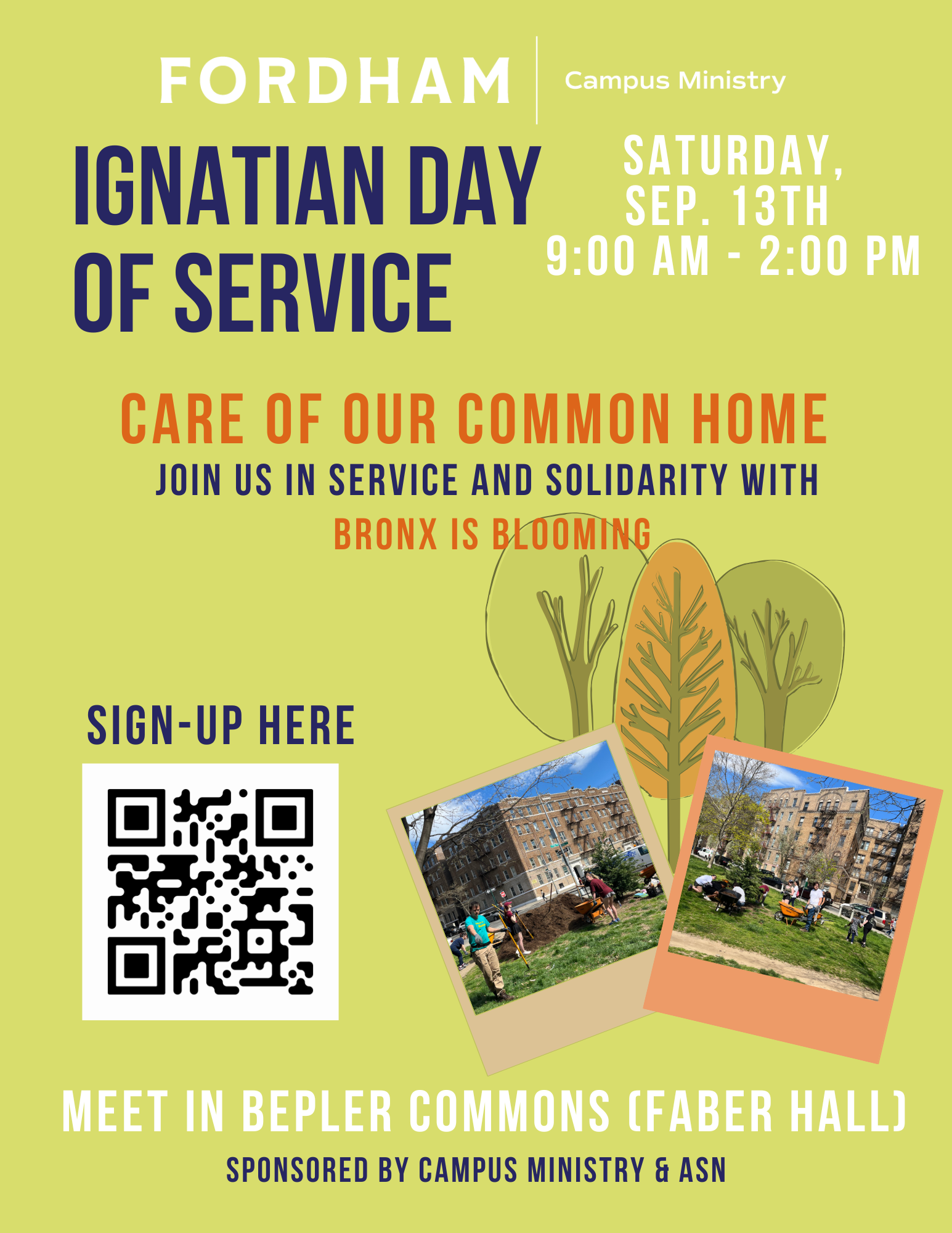 Join the Pedro Arrupe Volunteers, Alpha Sigma Nu, and Campus Ministry for an Ignatian Day of Service: Care for our Common Home! We will meet at 9 a.m. on the Rose Hill Campus in Bepler Commons, before walking over to a community park with our partners at Bronx is Blooming. Following a morning of community