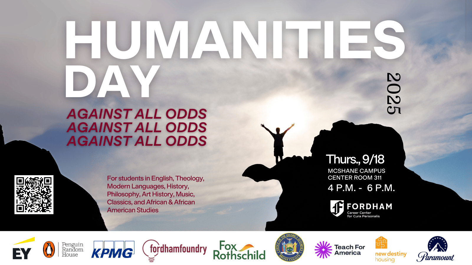 Join us for our third annual Humanities Day, a celebratory tribute to the richness and influence of the humanities! This year's Humanities Day theme, Against All Odds, will explore how individuals cultivate resilience through the inevitable challenges, detours, and setbacks that often accompany meaningful professional growth. Through our alumni panel and networking roundtables, we will