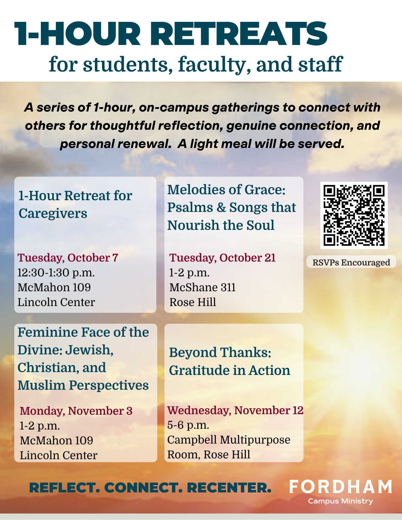 Come together over a light lunch to reflect on how Psalms can deepen your relationship with God. The One-Hour Retreats Series for students, faculty, and staff is a series of one-hour, on-campus gatherings to connect with others in a space for thoughtful reflection, genuine connection, and personal renewal. A light meal will be served. RSVPs