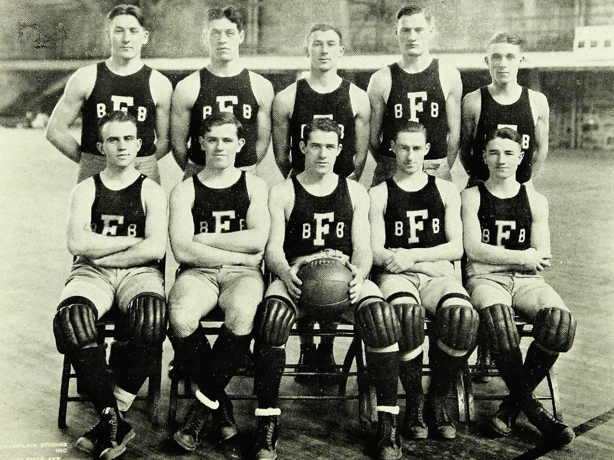 The 1925 Fordham men's basketball team poses for a group photo in their uniforms in the Rose Hill Gym