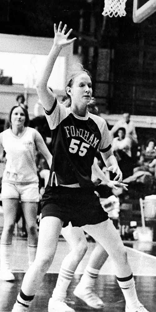 Fordham basketball player Anne Gregory O'Connell stands near the basket and holds up her hand calling for the ball in a late 1970s game in the Rose Hill Gym