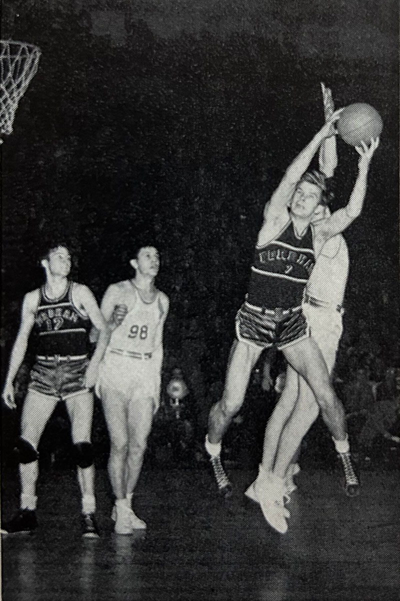 Fordham basketball player Bob Mullens leaps and holds the ball above his head, away from an opponent