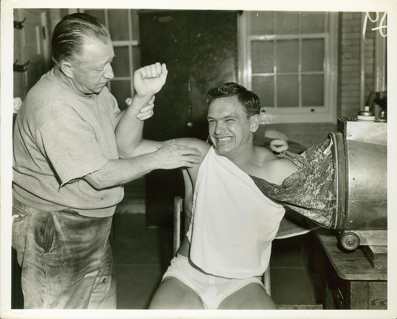 c. 1940: Trainer Jake Weber operates out of the gym’s basement. A fixture at Fordham for more than three decades until 1942, he also trains U.S. Olympic teams and is known for his “magic elixirs” and “baking machines” used to soothe student-athletes’ sore muscles.