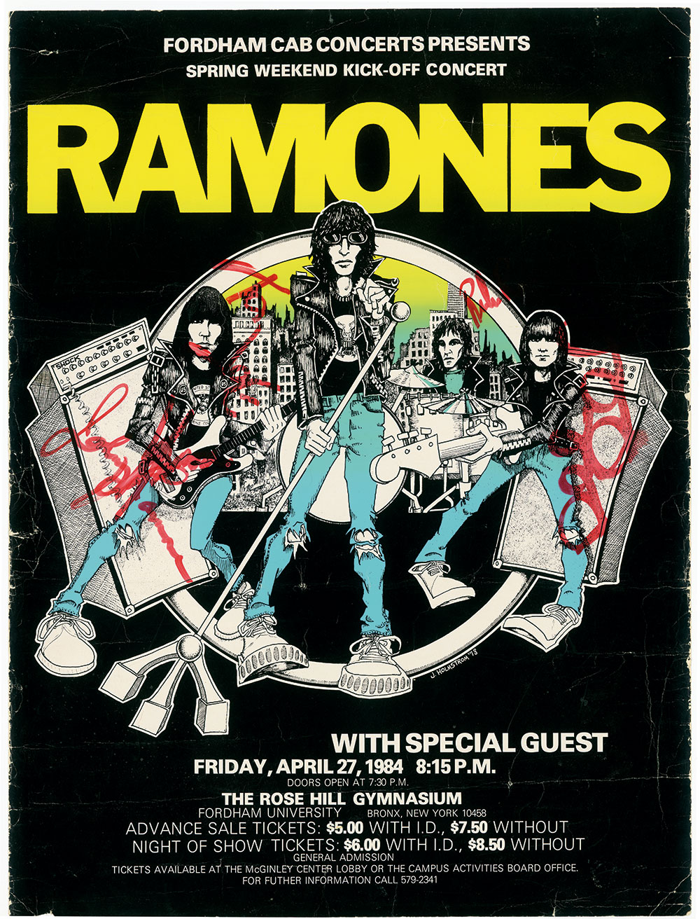 A poster, signed by members of the band, promoting the Ramones’ 1984 concert in the Rose Hill Gym