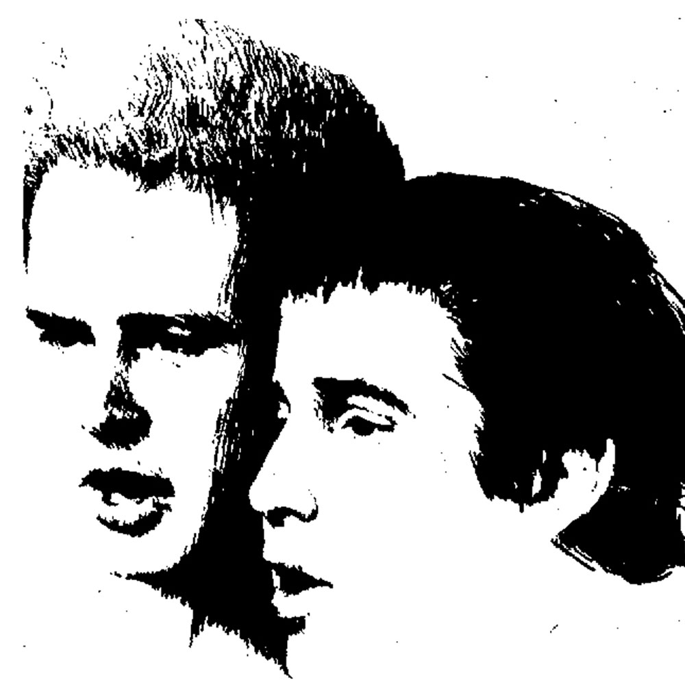 Black and white headshot illustration of Art Garfunkel and Paul Simon singing, circa 1967