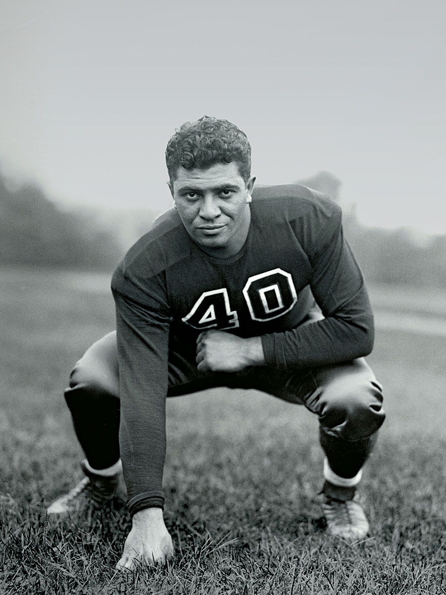 Vince Lombardi in his No. 40 Fordham uniform looks at the camera as he crouches in a football stance, one fist on the grass
