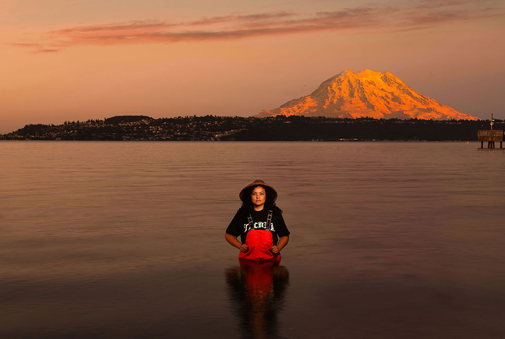 Amber Sterud Hayward, wearing red waders, stands in the water of Puget Sound in Tacoma, Washington, with a mountain in the background.