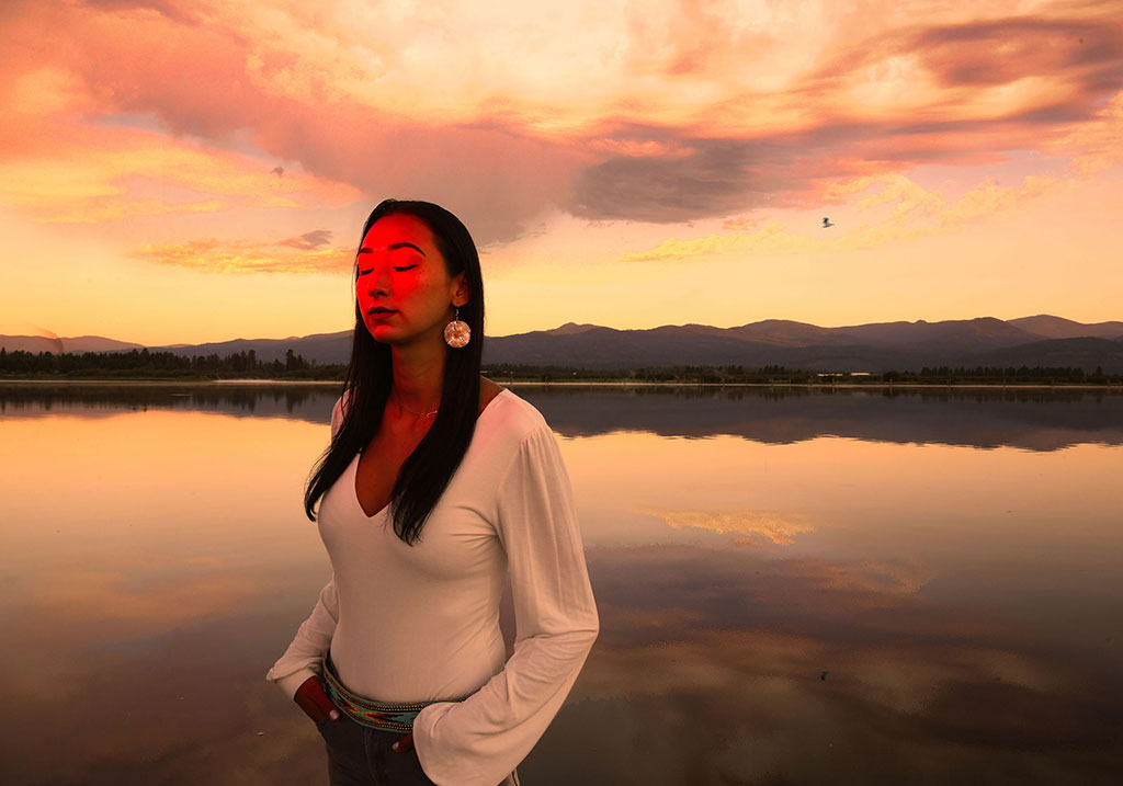 Jessie Isidore, wearing a white blouse, hands in jean pockets and eyes closed, stands facing the dawn near water in Usk, Washington.