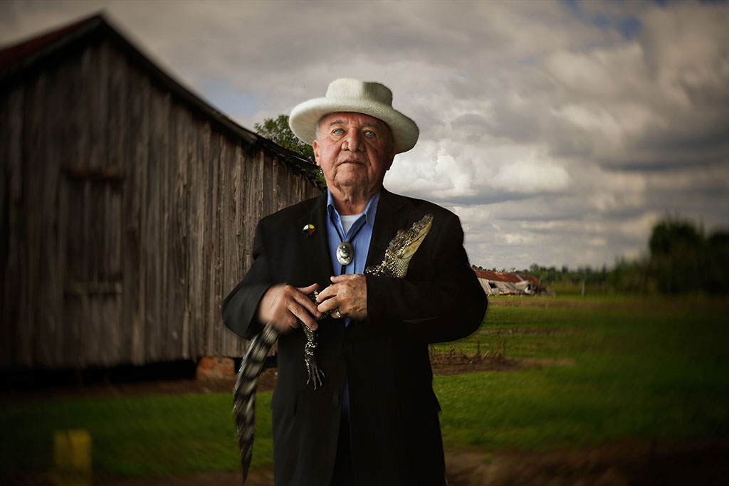 Whimsy is also evident in Van Sise’s portrait of former Houma chief Kirby Verret in Gibson, Louisiana. Verret and an alligator teamed up to show off the Houma French word onirique, or something that comes from a dream.