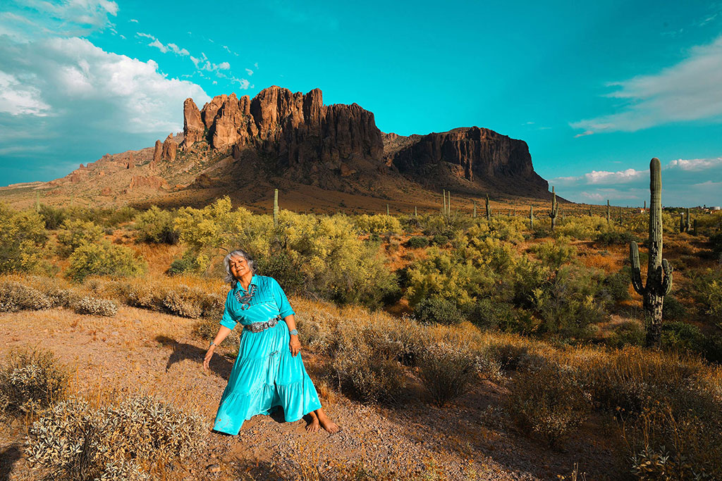Laura Tohe, former poet laureate of the Navajo Nation, leans to her right, wearing a turquoise dress in front of the Superstition Mountains and a turquoise sky