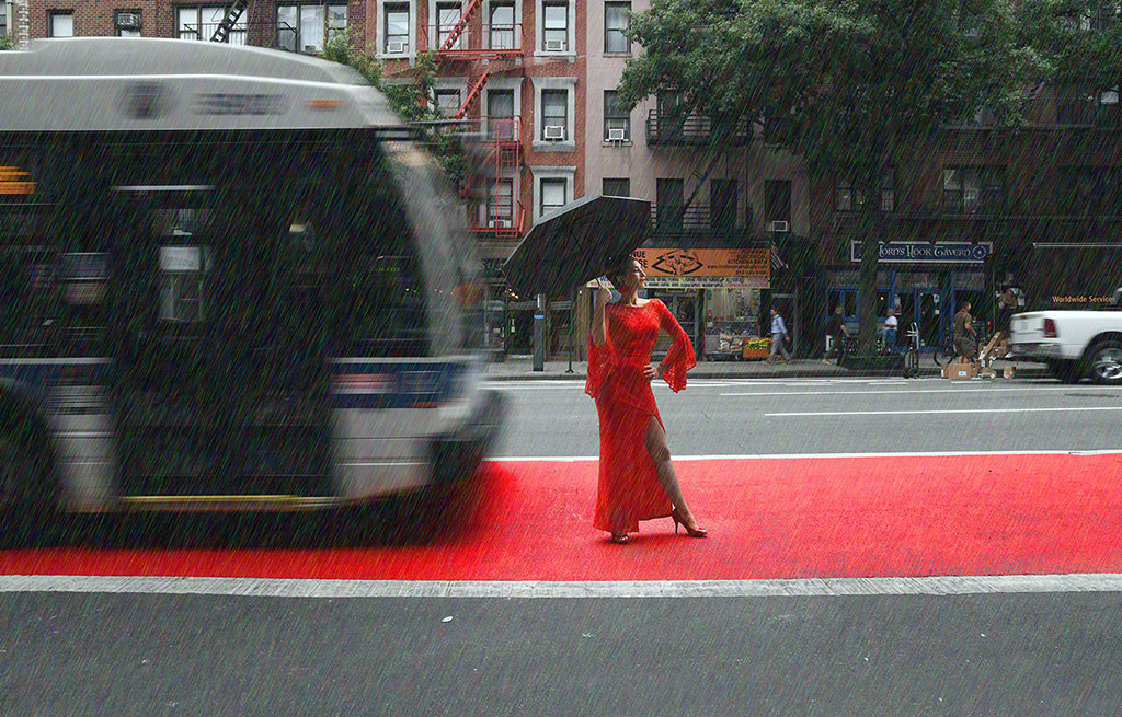 Sarah Aroeste, wearing a red dress, stands on a red carpet on a New York City street and holds up a black umbrella in the rain with her back to city bus approaching her.
