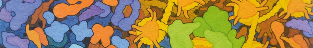 Detail from scientific illustration depicting the intricate molecular arrangement of an immunological synapse, showing blue and purple molecules. Illustration by David S. Goodsell, RCSB Protein Data Bank and the Scripps Research Institute
