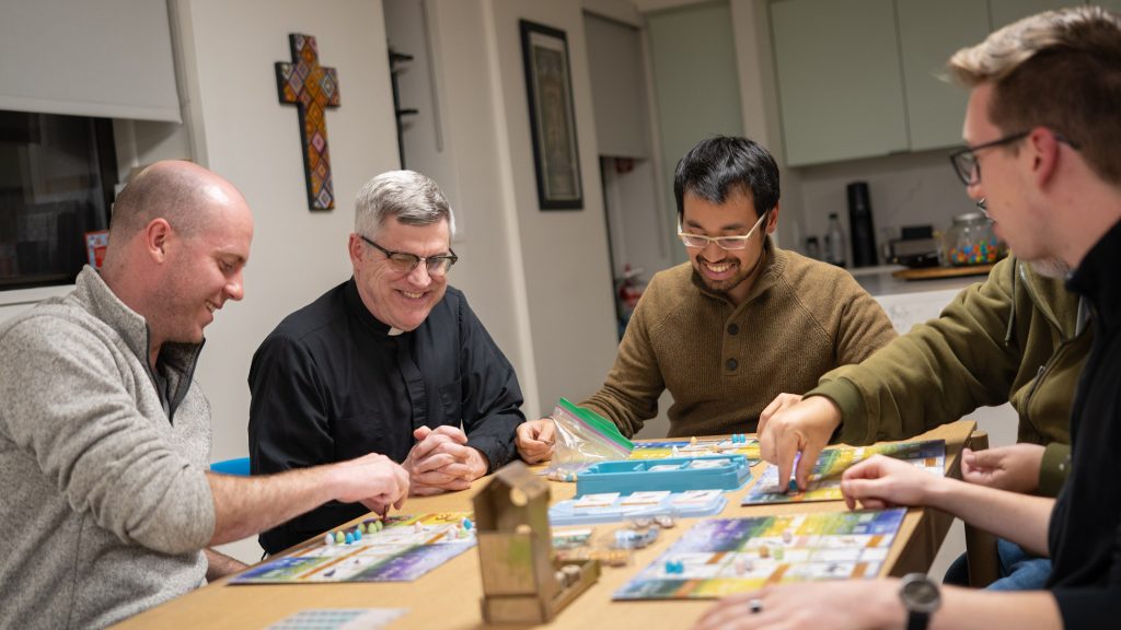 Rector William Sheahan, SJ (second from left), joins the men in a board game.