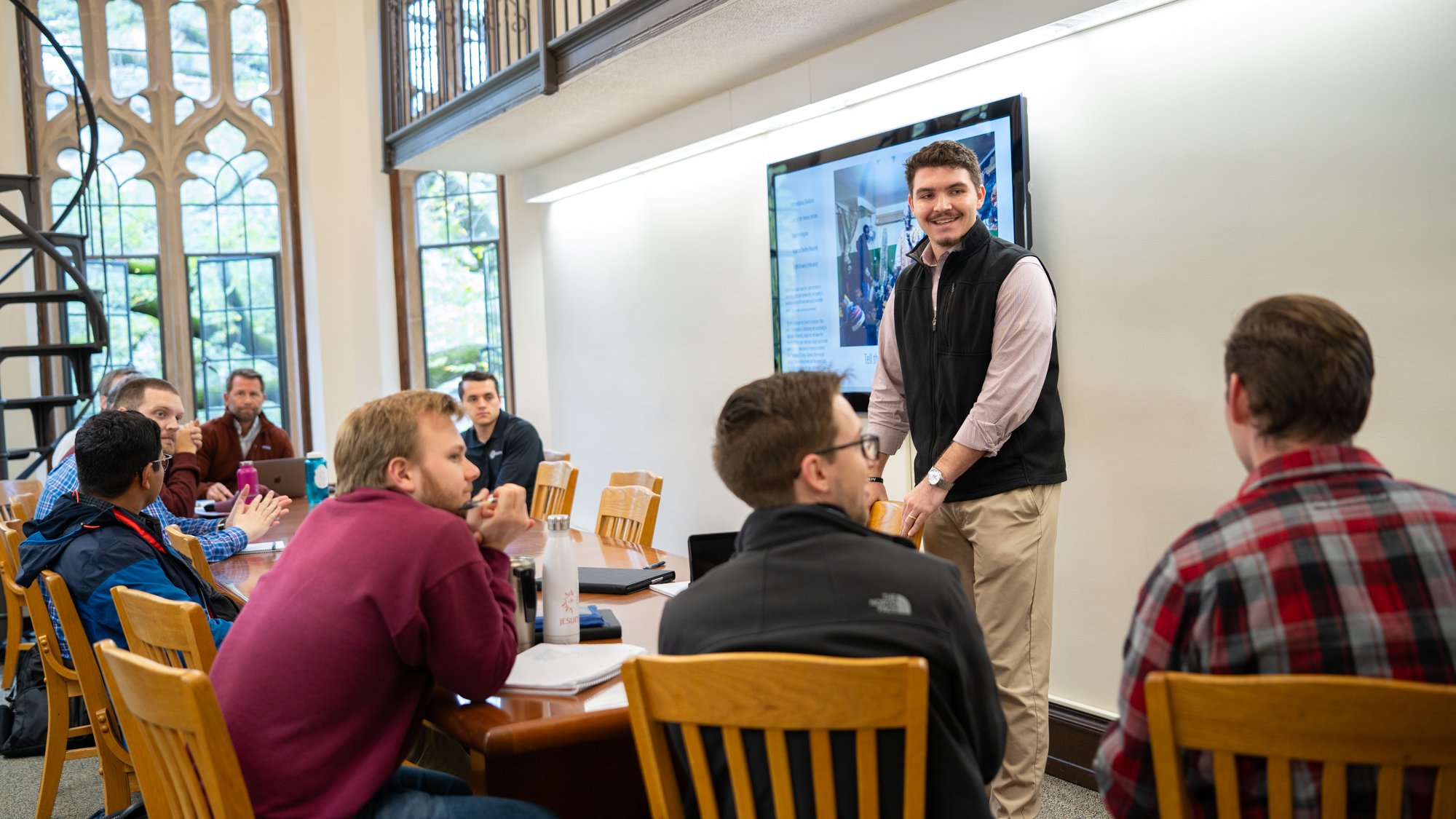 Jesuits-in-formation gather for “Contextual Learning in the Bronx” in a Duane Library seminar room.