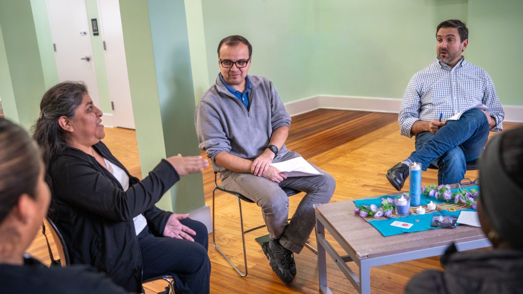 Alvaro Pacheco (center) and Carlos Martinez-Vela (right) listen to a member of Grupo de Mujeres Latinas during a storytelling class at Belmont Catholic Community Center.