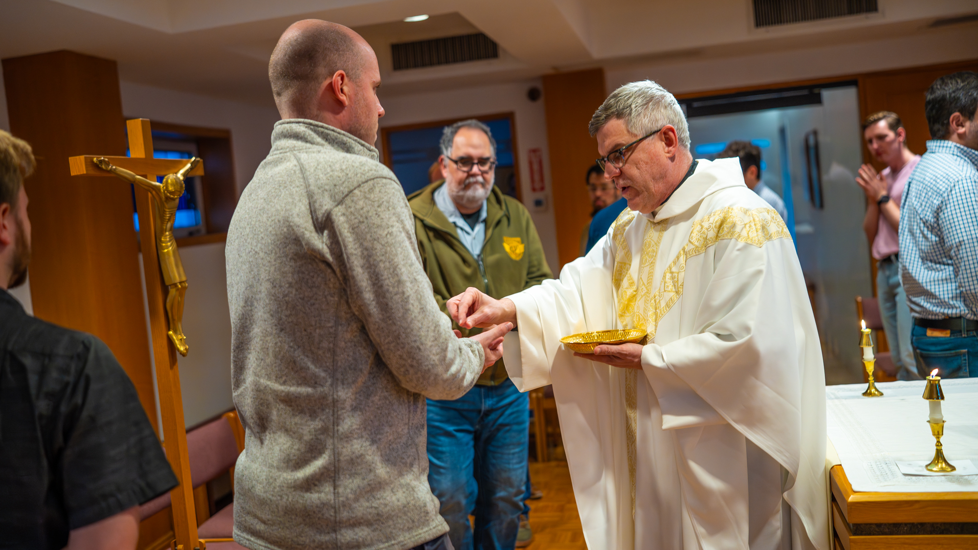 Robert Buckland (center) attends nightly Mass at Ciszek Hall.