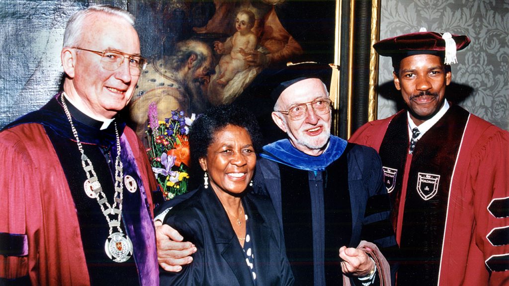 Denzel Washington received an honorary degree from Fordham at commencement on May 18, 1991, one year after earning his first Academy Award, for his work in the film “Glory.” He’s pictured here with (from left) Joseph A. O’Hare, S.J., then president of Fordham; his mother, Lennis Washington; and his Fordham mentor Robinson Stone.