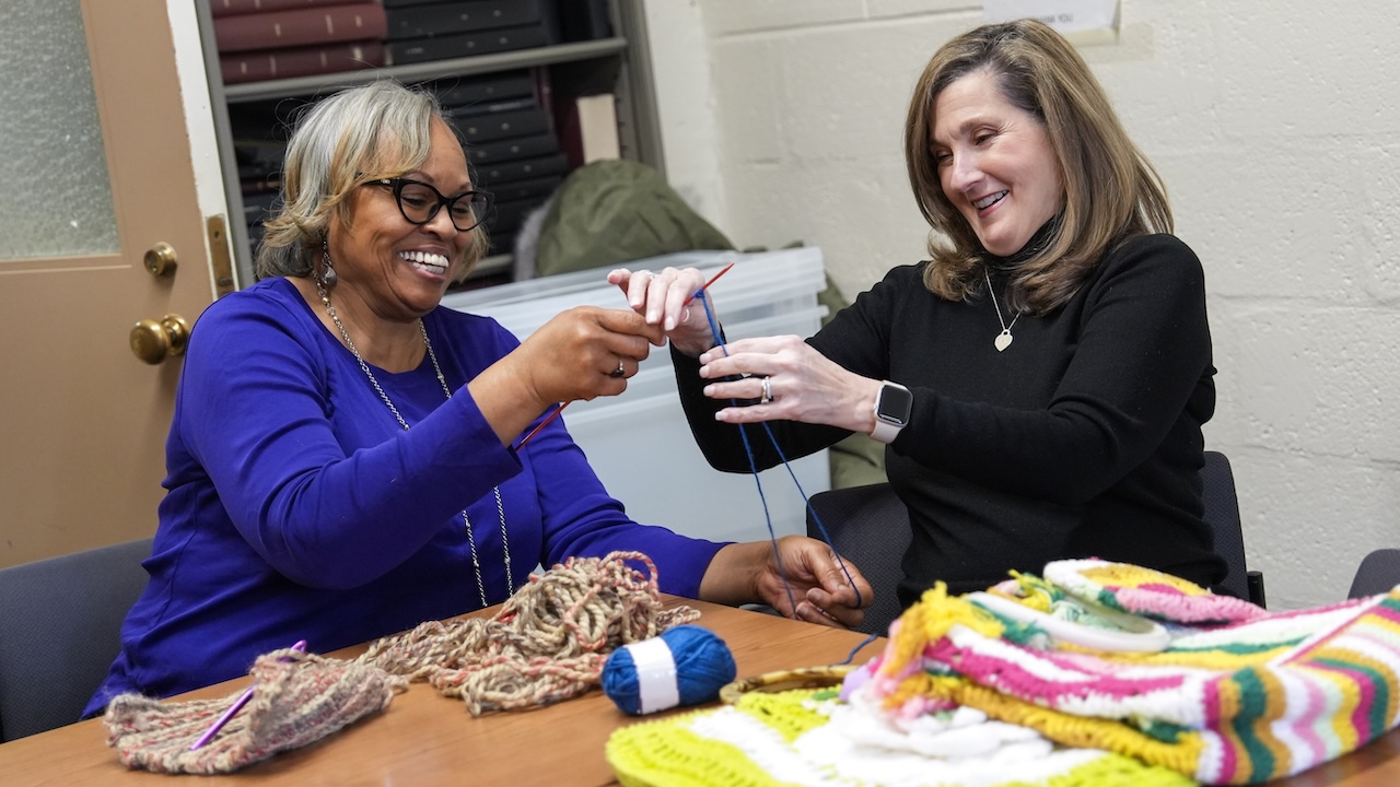 Knit, Chat, and Crochet began at Rose Hill in 2023, and every Wednesday, nearly a dozen regulars come during their lunch hour to knit and teach the newcomers who attend. Morgan has since made many blankets—and scarves, afghans, and hats—over the years, and still shows off her first creation, a purple scarf, with newbies, who can treat themselves to supplies that Morgan keeps on hand for drop-ins. Lincoln Center also has its own chapter of Knit, Chat, and Crochet that meets on Wednesdays.