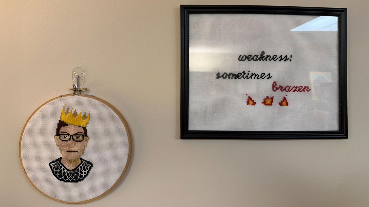 Two of Imperatori-Lee’s many cross-stitched artworks. Photo by Nicole Davis