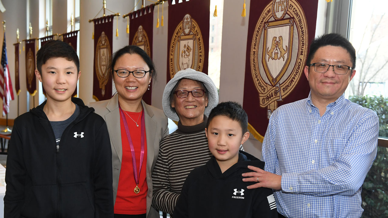 Verenika Lasku, center, surrounded by her family: Valentina (left) and Gabriella, both Fordham alumnae; and Robert, a sophomore at Fordham