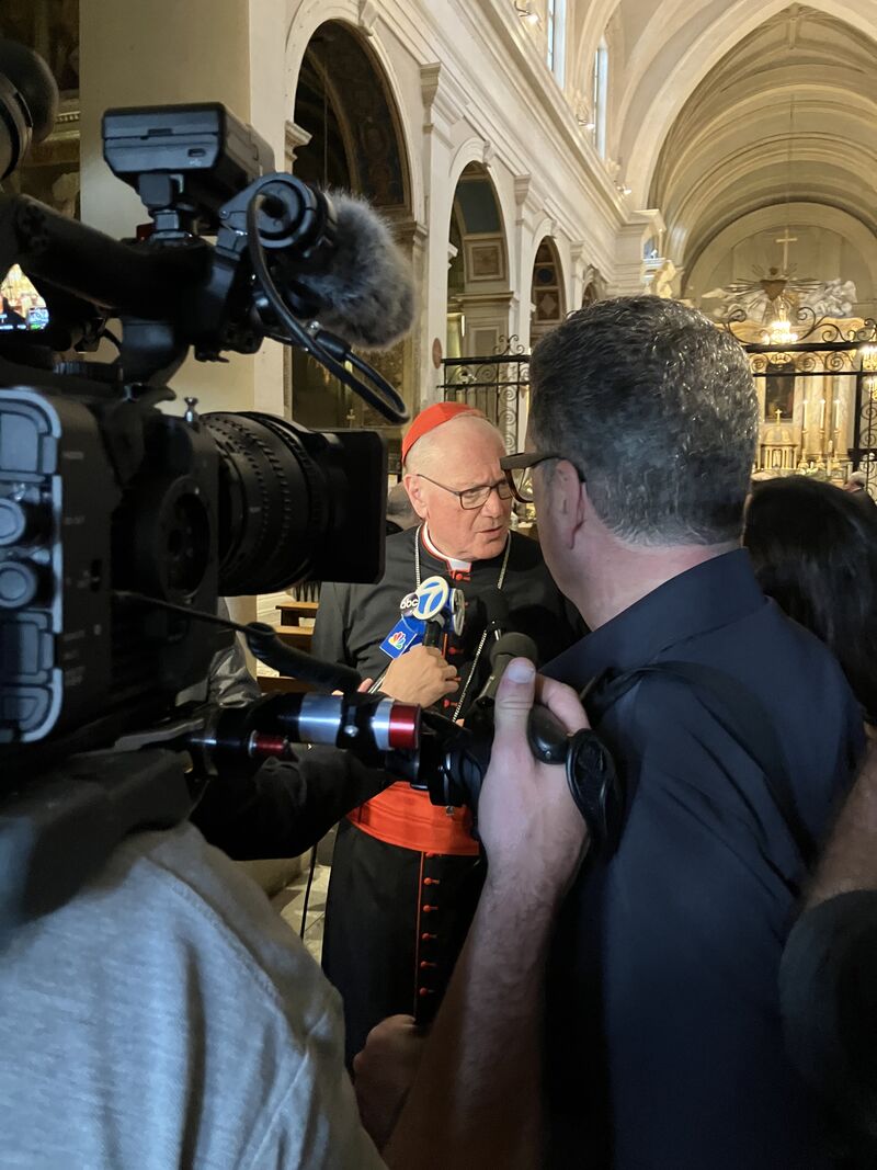 “This evening in Rome we joined a memorial Mass for Pope Francis celebrated by Cardinal Dolan. After Mass, the Cardinal was swamped by New York media.”
