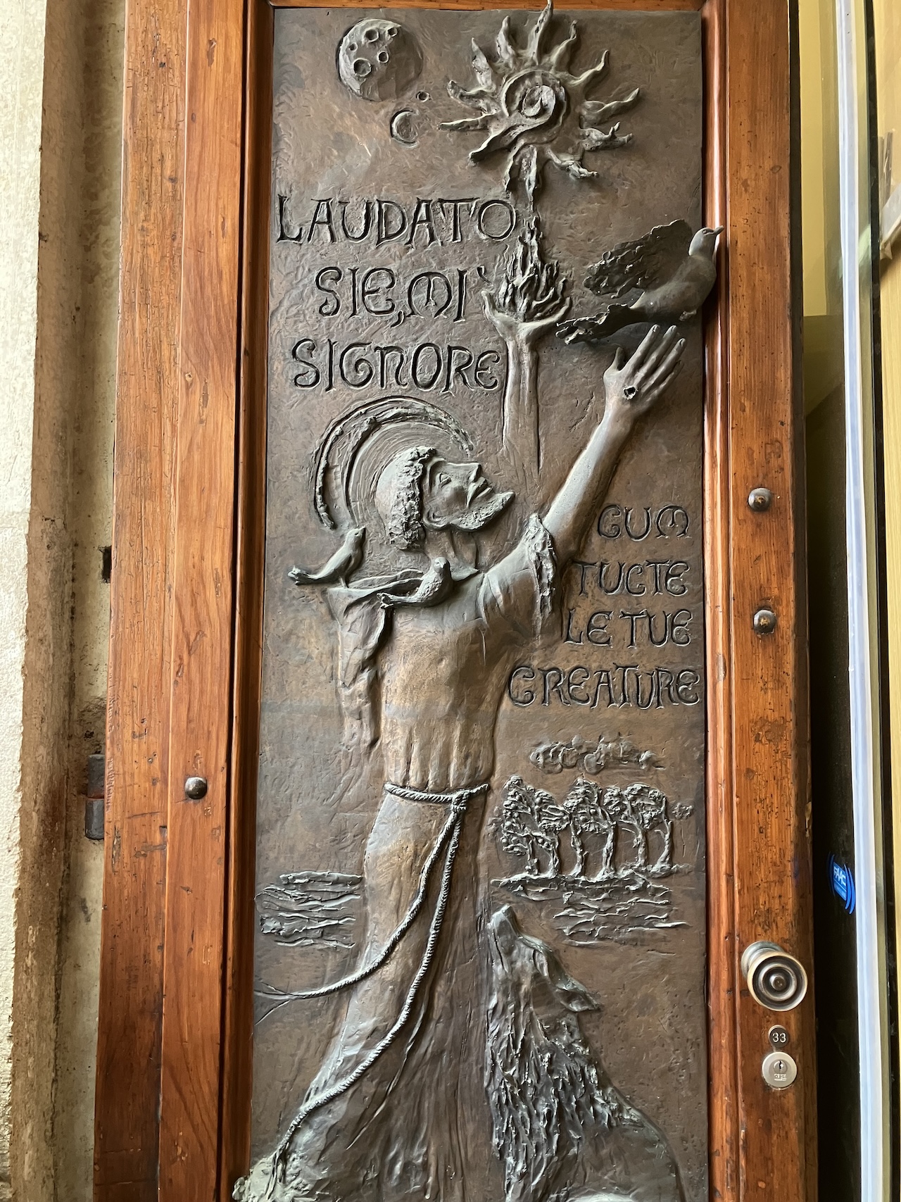 The third photo is Francis’ resolution of the contradictions between the first two photos. It is a photo of a door in the same church that very few will ever find or notice. If you need to use the restroom, you will probably pass quickly by it without ever observing it. The wooden door has a metal carving of St. Francis of Assisi proclaiming how all the wonders of creation give praise to God. There is the wolf and the birds, the forest and the sea, fire and the stars, and the moon and the sun. And carved into the door is the opening verse of St. Francis’ Canticle of the Creatures, “Laudato Si’.”