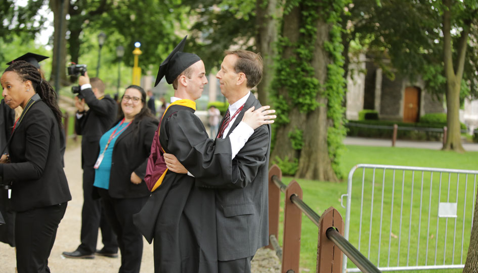 A few unmistakable sounds signal the start of Fordham commencement: the toll of the victory bell, the swell of “Pomp and Circumstance”—and the rallying voice of Sports Information Director Joe DiBari ringing out across Edwards Parade.