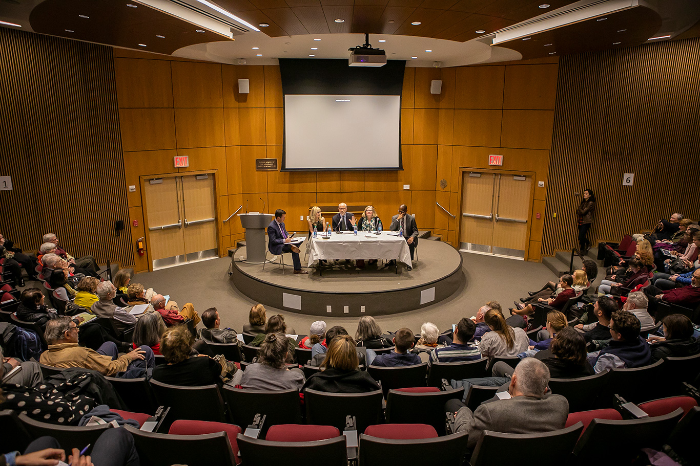 Panelists sit on stage at the McNally Ampitheatre