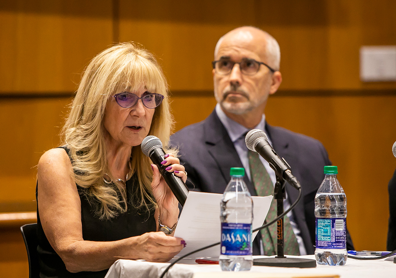 Celia Fisher speaks from the stage at the McNally Ampitheatre
