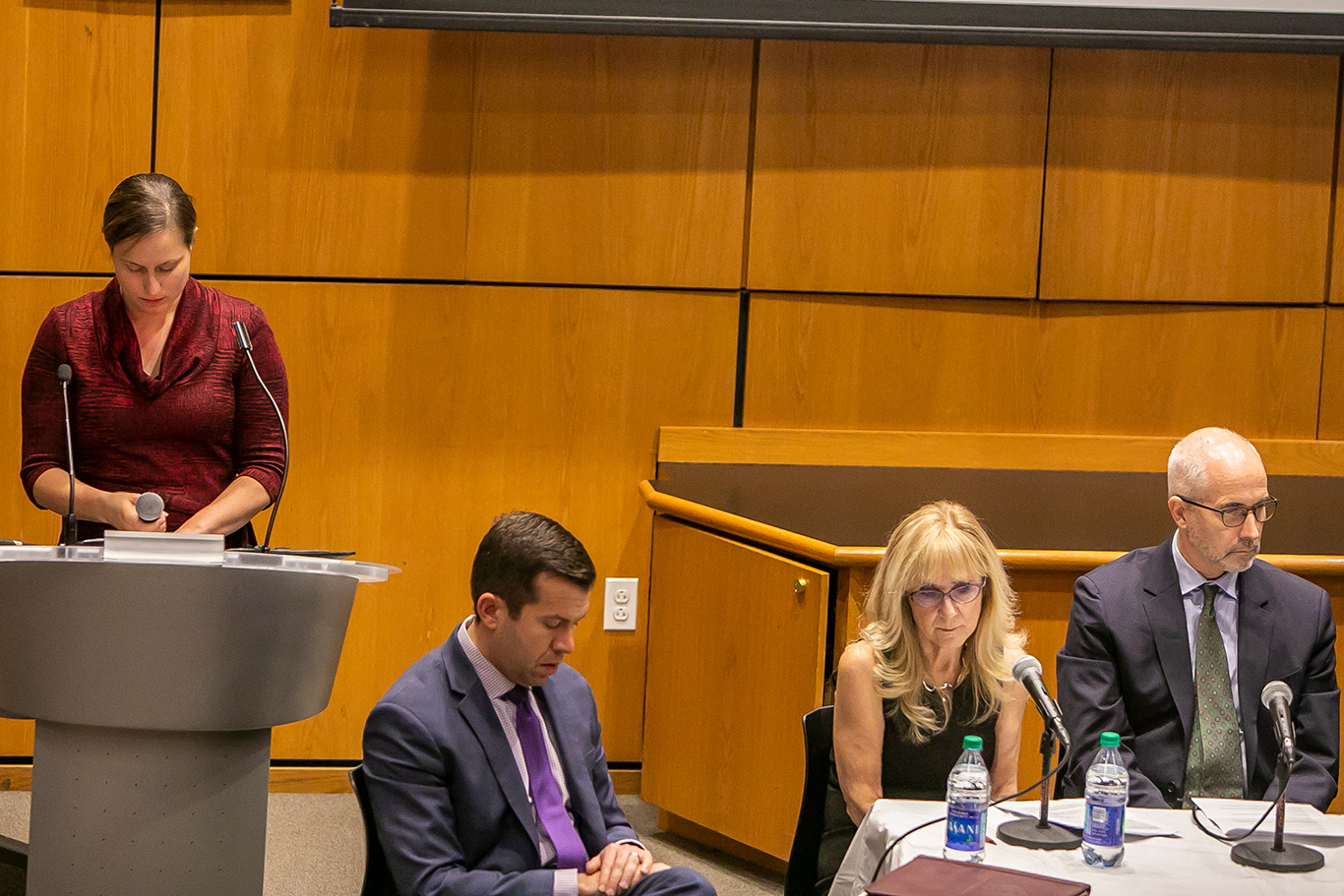 Erin Hoffman, associate director of Campus Ministry for Spiritual and Pastoral Ministries at Lincoln Center and director of Ignatian Initiatives, stands at a podium with her head down, at the McNally Ampitheatre