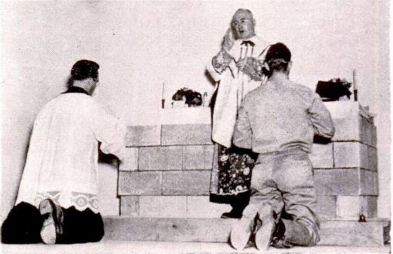 Francis Spellman, New York’s Roman Catholic Archbishop and the Vicar General of the Army and Navy, was pictured presiding over Mass not in the splendor of St. Patrick’s Cathedral, but at a crude, makeshift altar built of large bricks, created for troops stationed in Egypt. It contained a “portable altar stone,” the caption noted, and allowed the cardinal “to consecrate any convenient table where Mass was called for.”