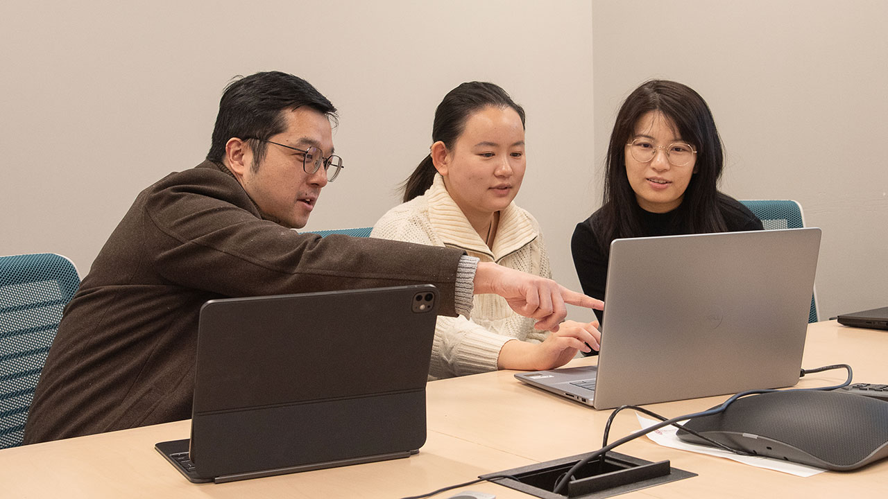 Ying Mao and Ascend Quantum teammates Shuwen Kan and Yin Su reviewing quantum computing research at the Rose Hill campus. Photo by Chris Gosier