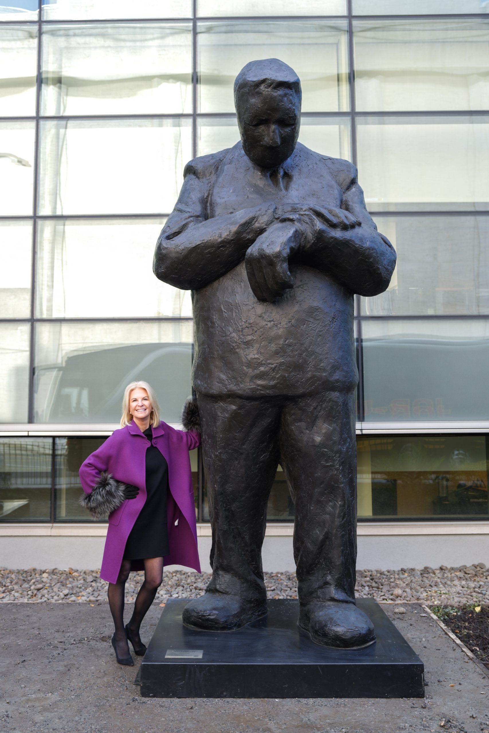 Fordham Trustee Kim Bepler stands in a purple coat leaning against a monumental sculpture of a male figure by Jim Rennert