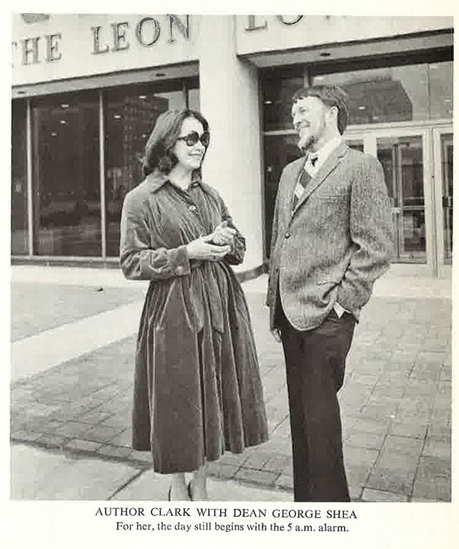 A spring 1978 FORDHAM magazine piece featured Clark and her newfound success: “These days find her literally winging into her classes at Lincoln Center from all points of the U.S., where she is moving in and out of editorial rooms and television studios on interview and talk show tours to promote her latest piece of fiction. She has also moved in with the Beautiful People. Last week People Weekly chronicled her rise to literary fame and fortune in a two-page spread, and also quoted her ecstatic comment about her new apartment facing Central Park. (‘Every Irish-Catholic girl from the Bronx wants to have an apartment on Central Park South.’)”