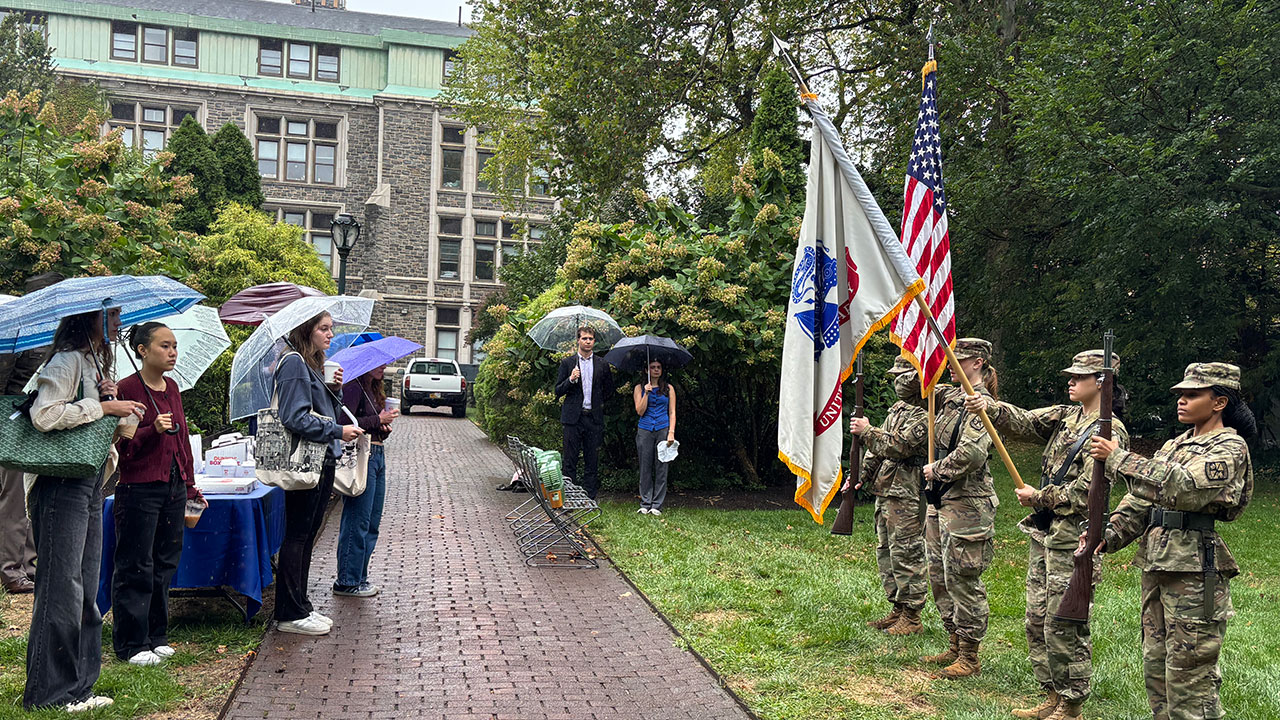 The gathering included a color guard ceremony featuring members of Fordham’s ROTC.