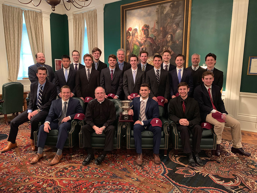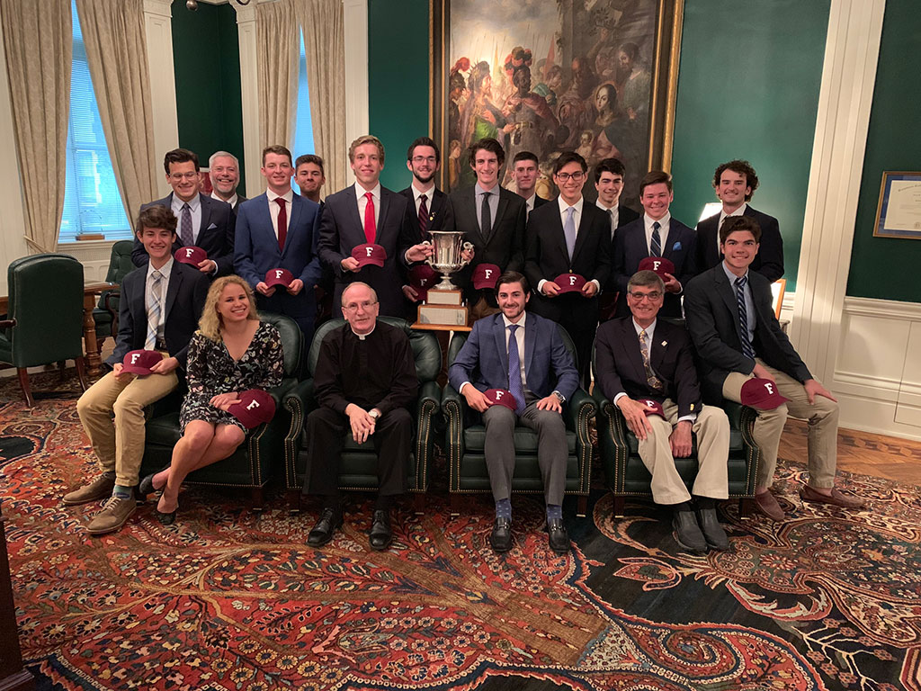 In a ceremony at Cunniffe House on April 26, the team presented the cup to Joseph M. McShane, S.J., president of Fordham.