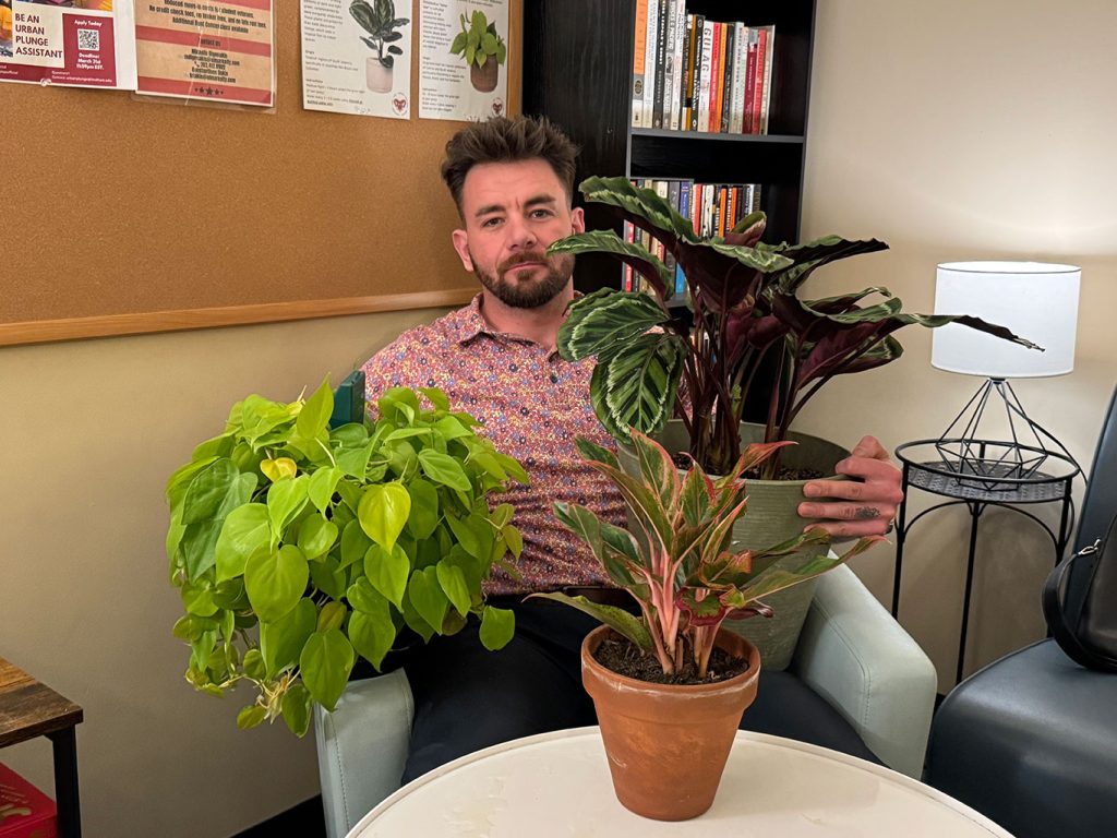 Adrian Kochanowicz with the plants he shares his office with at the Lincoln Center campus. | Photo courtesy of Adrian Kochanowicz