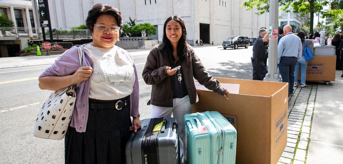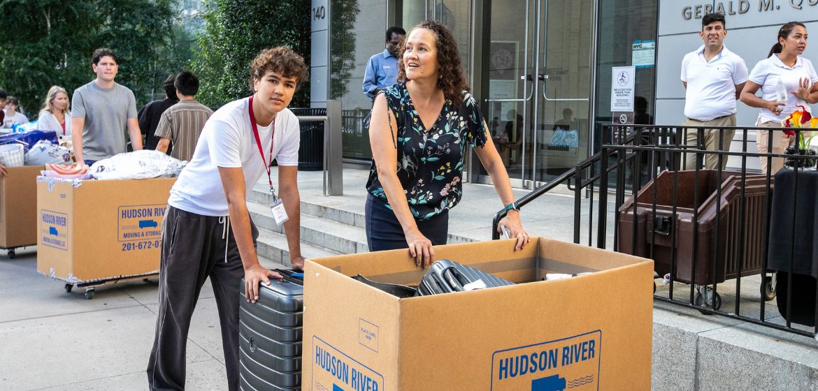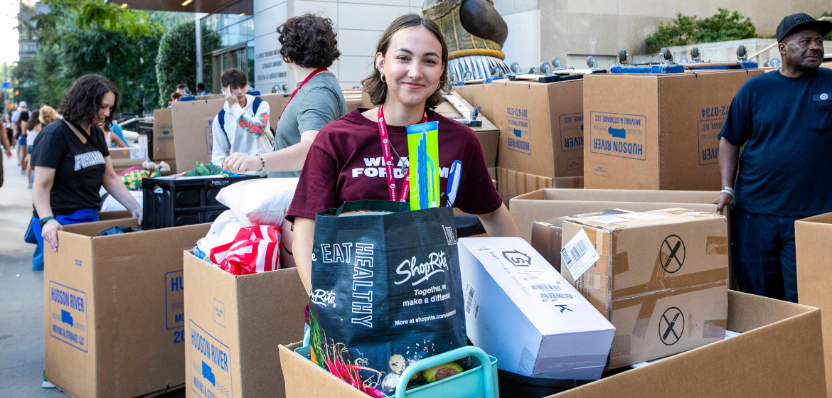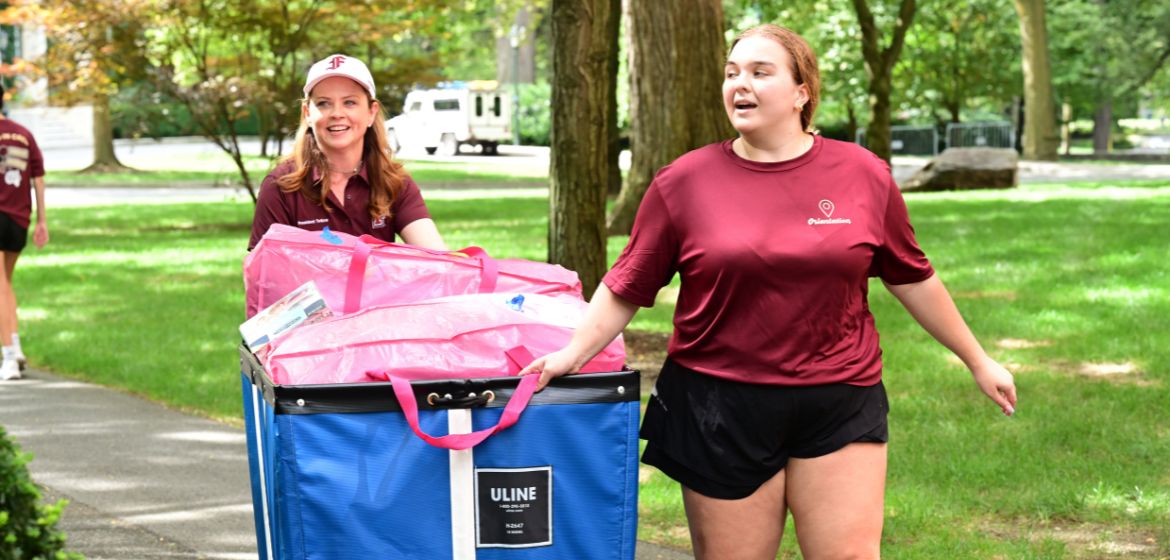 Families pulled up to campus in cars brimming with essentials as well as sentimental items to help students feel at home. They were welcomed by Fordham’s spirited orientation leaders, who brought both energy and muscle to the occasion, greeting their fellow Rams and helping them roll large bins full of belongings into their new spaces.