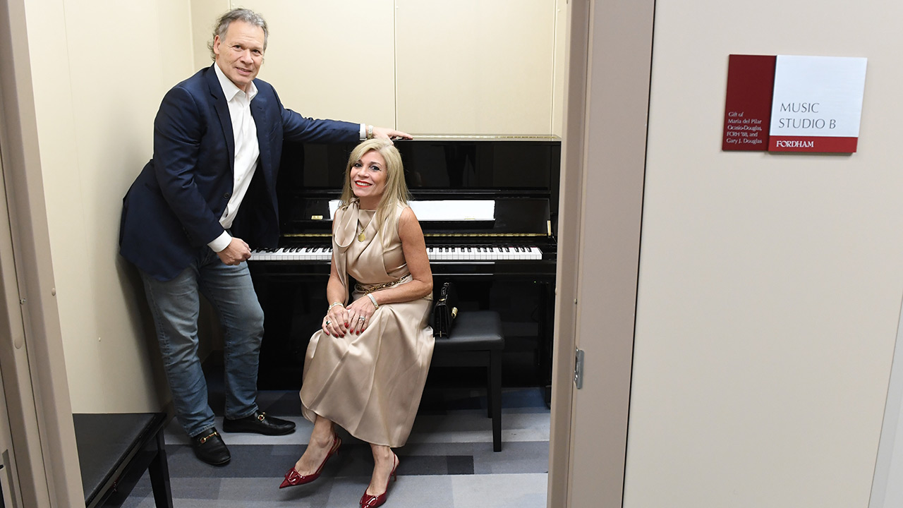 Love for music also motivated Maria del Pilar Ocasio-Douglas, FCRH ’88, and her husband, Gary J. Douglas, to support the project. Music is a creative outlet for both of them, and for their son, James, a Fordham junior majoring in film, who taught himself piano during the coronavirus pandemic, she said.