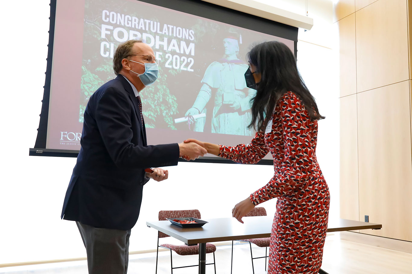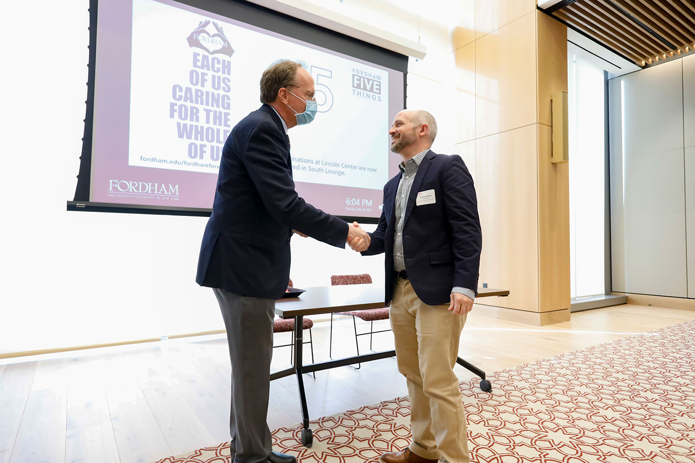 Joseph M. McShane, S.J., president of Fordham, praised the faculty members, who hailed from the arts and sciences, business, law and social service, for their service during the past two difficult years.